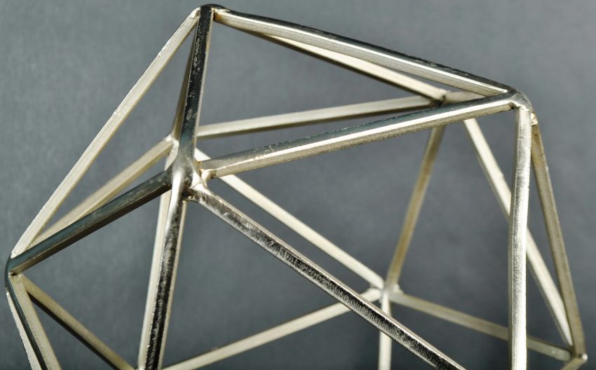 A contemporary retro vintage modern art British studio sculpture. The statue of metal construction consisting of interlocking squares and raised on plinth base. Measures approx; 40cm.