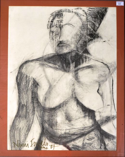 A 20th Century British School retro vintage 1980's charcoal portrait study painting depicting a nude figure. The figure front facing with shaded features on a white ground. Signed by artist. Framed and glazed. Measures approx; 81cm x 64cm.