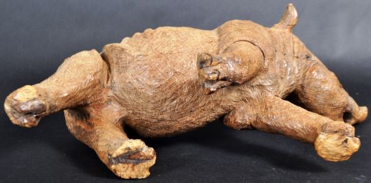 A retro vintage 20th Century carved root wood figure in the form of a Rhino with carved features and detailed skin. Measures approx; 19cm x 33cm.