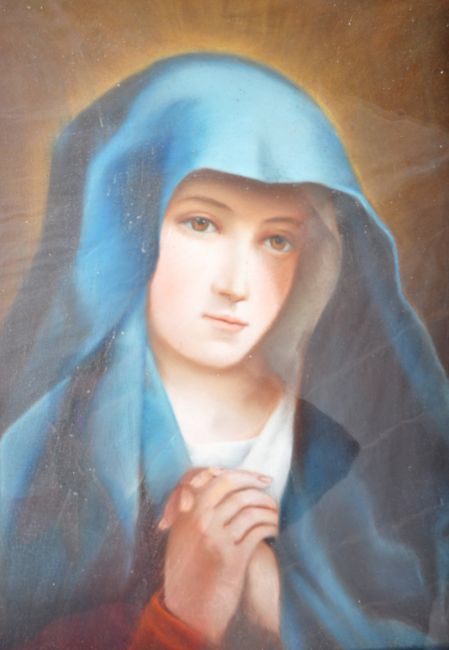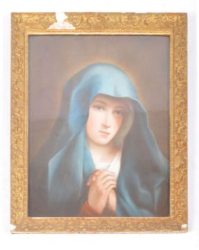 A mid 20th Century French school pastel portrait painting study depicting Mary The Mother. Unsigned. Framed & Glazed. Measures approx; 64cm x 54cm.
