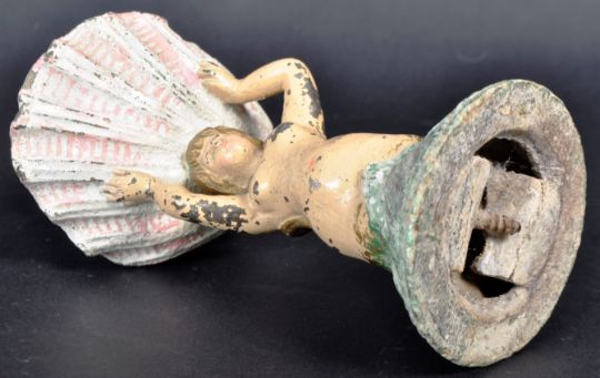 A vintage 20th Century 1920's polychrome painted cast iron soap dish holder in the form of a mermaid sitting upon the waves holding seashell over her head. Wear commensurate with, mostly to the paint work. Measures approx; 16cm x 8cm diameter.