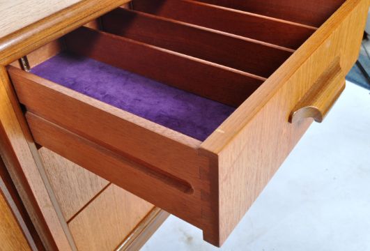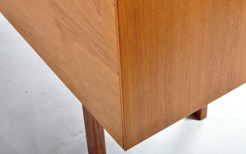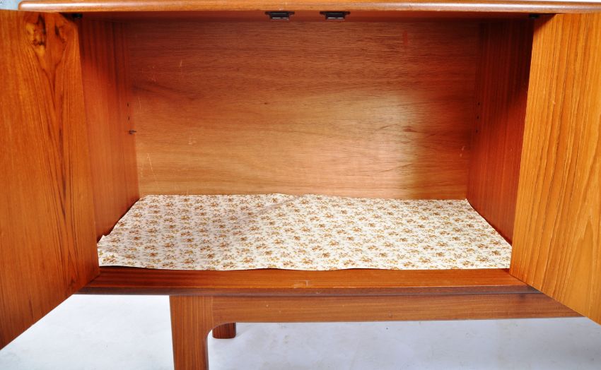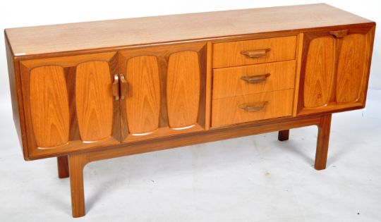 Victor B. Wilkins - G Plan - Brasilia - A retro vintage 1960's G-Plan teak wood sideboard credenza comprising of an off set bank of three graduating drawers flanked by double cupboard doors to the left and full cocktail drinks section to the right. Paneled door fronts with all raised on square legs. Measures approx; 79cm x 173cm x 45cm.