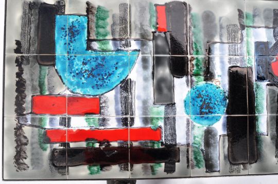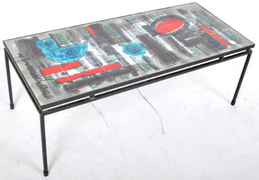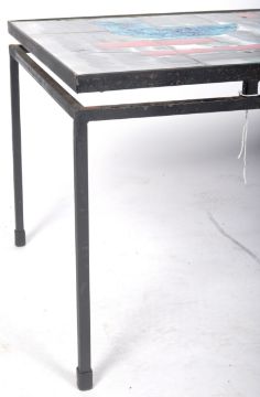 J Belarti (Belgian) - A mid 20th Century tiled topped coffee table with abstract multi coloured enamelling decoration raised on metal supports. Signed to one corner. Measures approx; 41cm x 109cm x 47cm.
