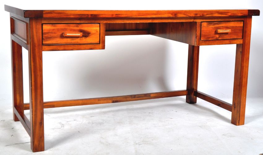 Manner of Laura Ashley - A retro vintage 20th Century contemporary pine writing table desk. Comprises a chamfered edge writing area top with central kneehole recess flanked by banks or drawers all raised on shaped legs. Measures approx; 73cm x 139cm x 65cm.