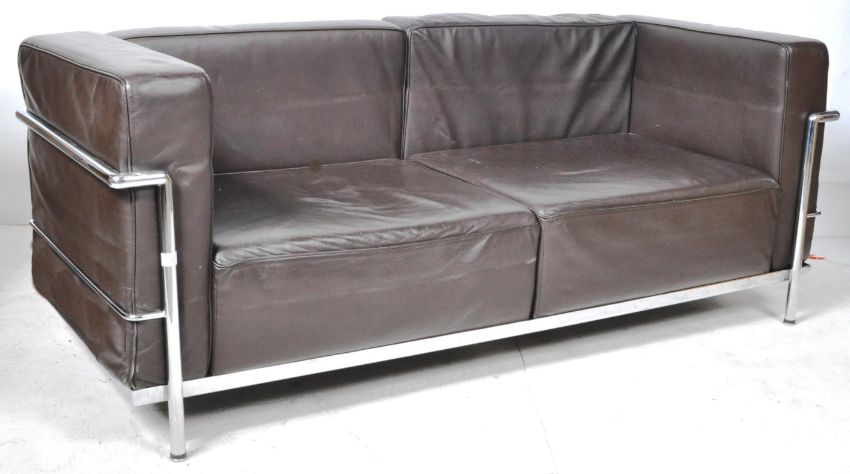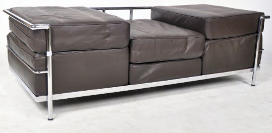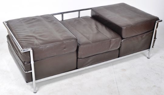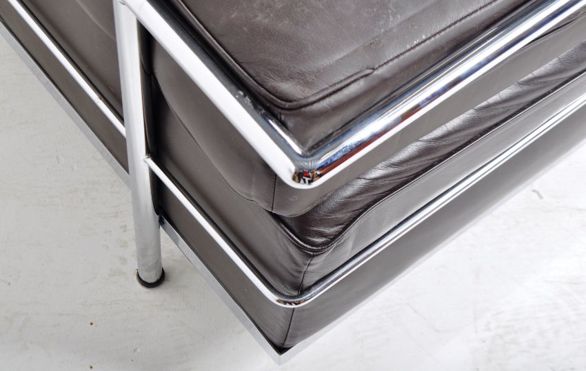 After Le Corbusier - LC3 - A LC3 type three seat club sofa settee having an exterior tubed chrome finished frame being upholstered in a brown leather upholstery complete with squab cushions. Measures 51cm x 161cm x 72cm