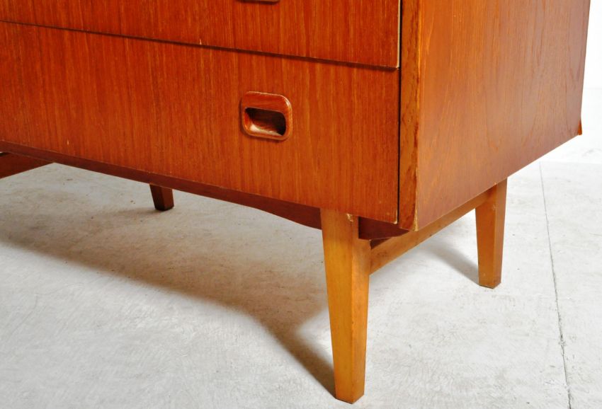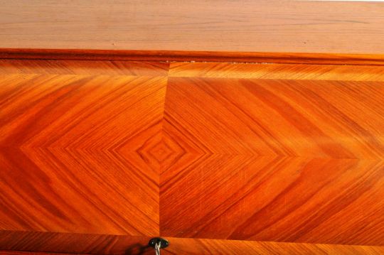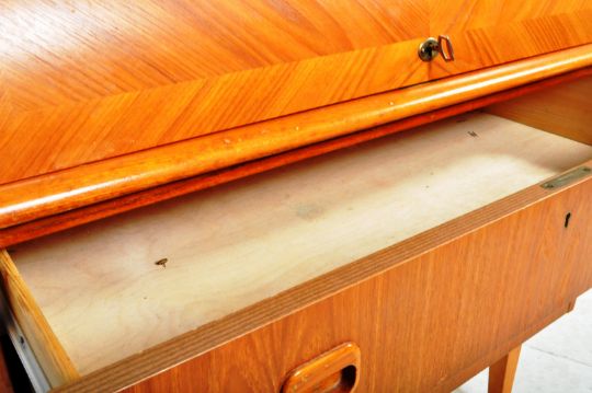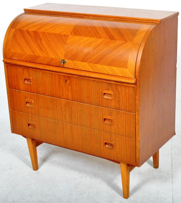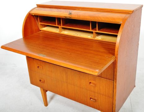 Egon Ostergaard - An original retro vintage 1960's Scandinavian Swedish Danish influence teak wood cylinder bureau desk having a beautiful quarter panel veneer top opening to reveal a fully appointed interior raised over a three drawer chest of drawer base set on tapering legs. Missing the drawers within. Measures approx; 98cm x 91cm x 47cm.
