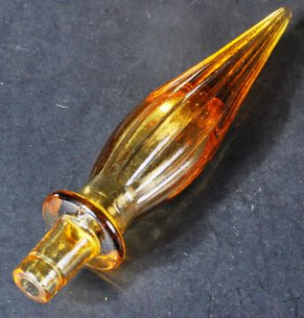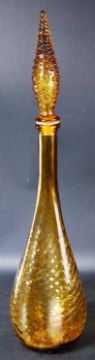 Empoli Glass - Genie bottles - A collection of four retro 20th Century amber coloured genie bottles one by Wayne Husted for Stelvia decorated with fish. One with a ribbed stopper another pinched shape form and one short example with large ball stopper. Tallest measures approx; 61cm.