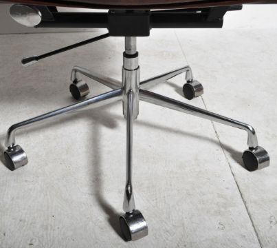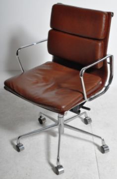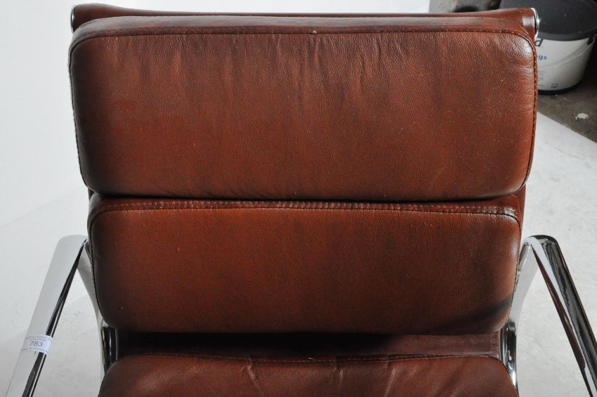 Office Soft Pad Chair - A contemporary chrome and faux leather low back swivel office desk chair / armchair in the manner of Charles & Ray Eames. The chair of polished metal construction having tan brown upholstery with padded backrest with all being raised on five point star base with castors. Measures approx; 90cm x 58cm x 52cm.