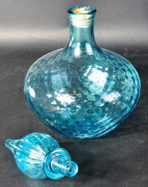 Empoli - Genie bottles - A collection of four retro vintage 20th Century studio art glass bottles / decanters two of squat globular form with shaped stoppers atop. One in blue and the other amber. Together with two waisted examples one in red and the other blue. Tallest measures approx; 59cm.