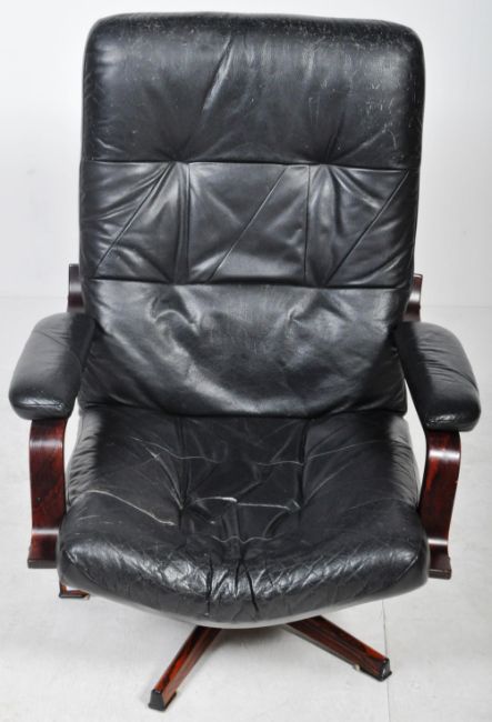 A retro 1970's bentwood and black leather armchair / easy lounge swivel chair having padded back, seat and armrests supported by a bentwood frame with black leather upholstery. Raised on a five point faux wood metal base. Arm chair measures approx; 113cm x 74cm x 63cm.