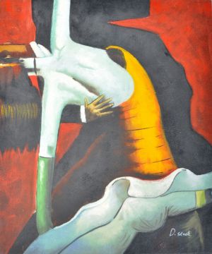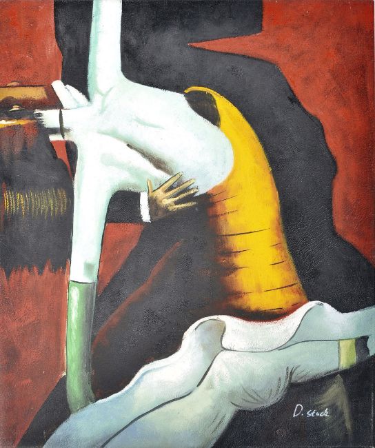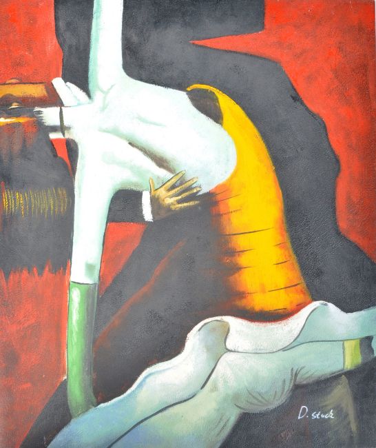 A 20th Century retro vintage oil on canvas surreal abstract painting depicting two dancers. Bold hues of red, yellow & green with black flask ground. Signed D Stack. Measures approx; 82cm x 51cm.