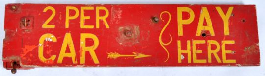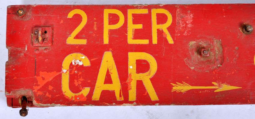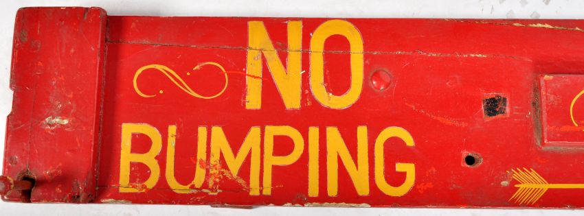 Bumper Cars - Two retro vintage mid 20th Century fairground / funfair hand painted wooden signs with each having yellow lettering on red ground. One sign reading 'No Bumping' and the other '2 Per Car - Pay Here'. Each measures approx; 21cm x 85cm.