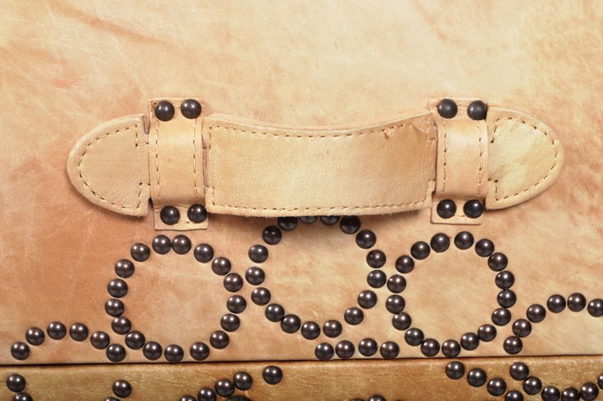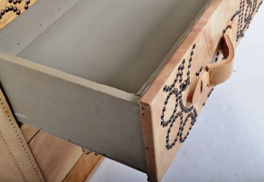 Andrew Martin Furniture  - British Contemporary Design - Original Andrew Martin Parchment leather chest of drawers. The leather chest with studded crown design to the centre of the bank of 3 drawers having strap handles to each drawer. Measures 90cm x 99cm x 50cm