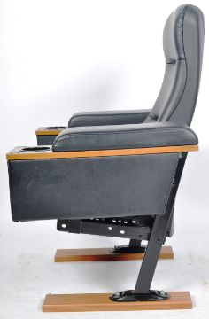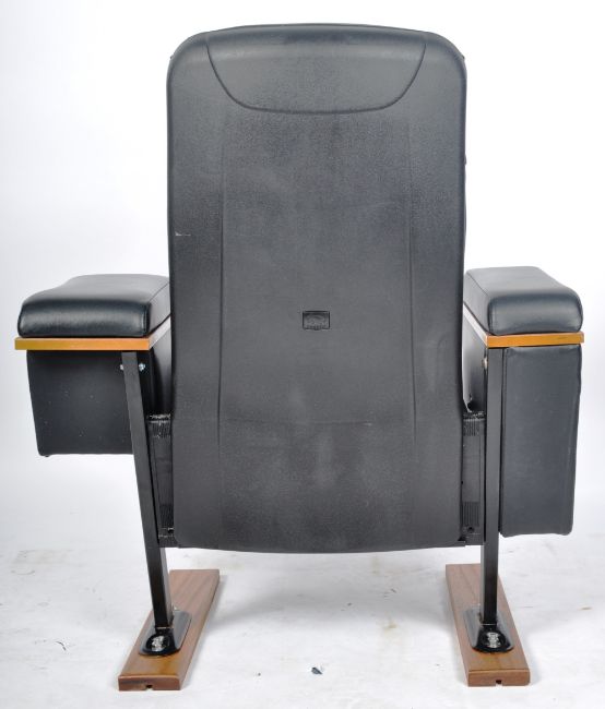 A 20th Century retro Cinema Chair in the Lazy Boy Style. Black leather / leatherette back and seat with broad armrests featuring twin large cup holders. The armchairs featuring the original 3/4 seat numbers and having a black metal frame mounted on hardwood legs. Ideal for home cinema or as a gaming chair. Measures approx; 106cm x 90cm x 64cm.