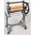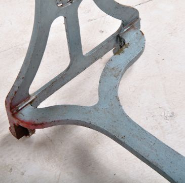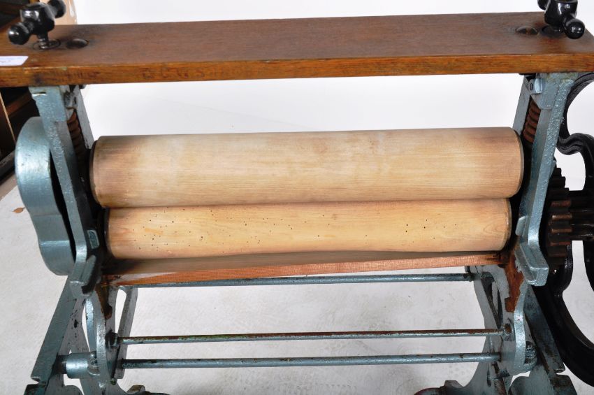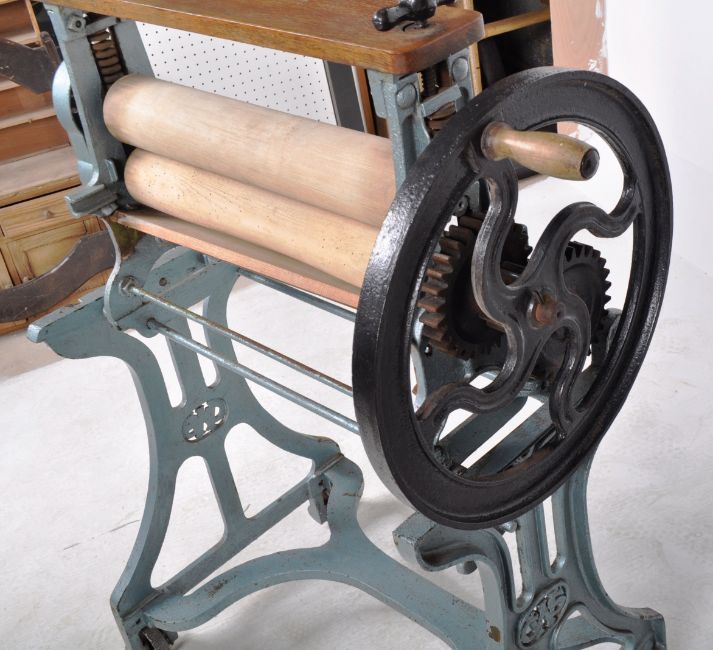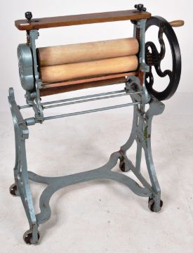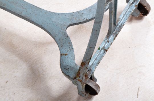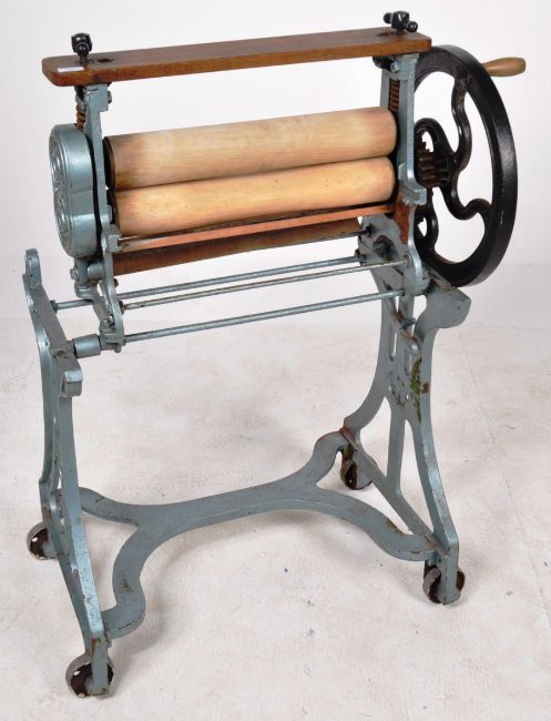 A vintage early 20th Century CAS wrought iron and wooden mangle shop display / garden feature. Finished in blue with all being raised on castors. Measures approx;