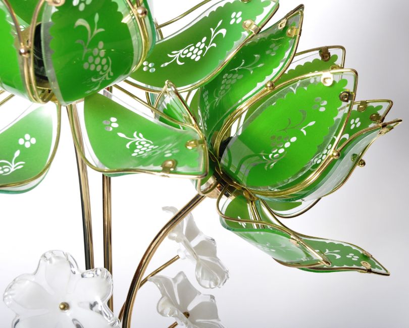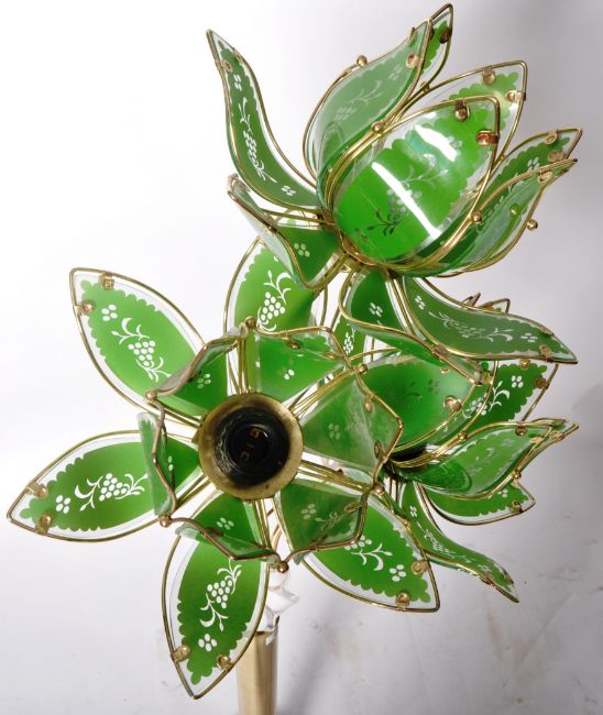 A retro vintage mid 20th Century Italian Designer upright standard lamp light of brass construction. The lamp having a series of protruding brass arms with with green coloured glass shades in the form of flower heads with frosted floral decoration to each panel and smaller flowers underneath. Cylindrical brass column raised on a circular base. Measures approx 166cm.