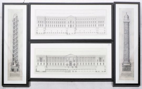 Eichholtz - A set of 4 framed and glazed architectural etchings by Eichholtz. To include interior and exterior of a tower with notation below and also 2 palace views with notation. Framed and glazed. Largest 110cm  x52cm
