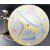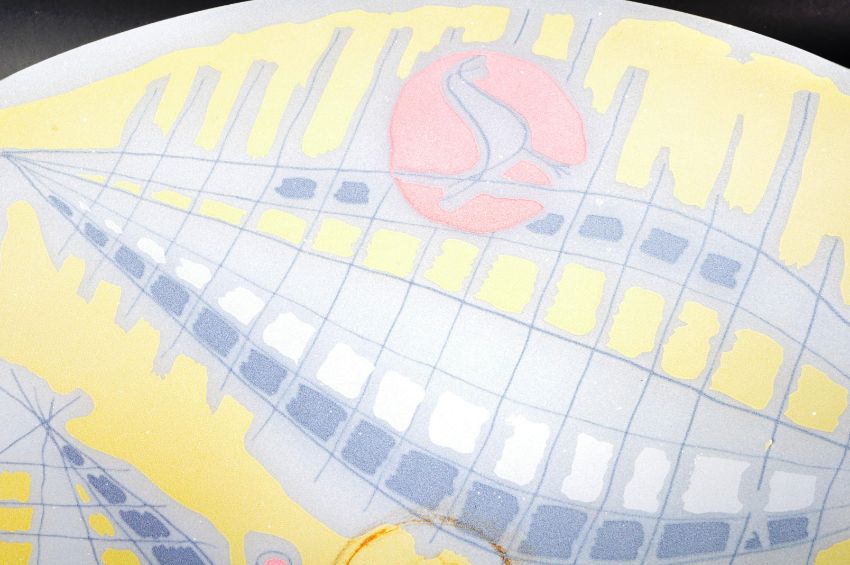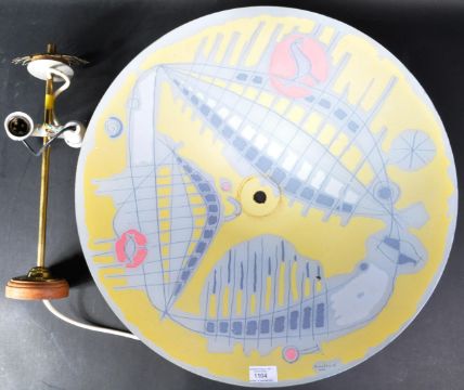 A large retro mid 20th Century hanging glass ceiling light shade of disc form having a yellow and white painted ground with black and red painted patterns throughout. Suspended via teak and brass fitting. Signed Scatland. Measures approx; 54cm diameter.