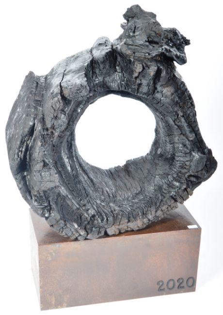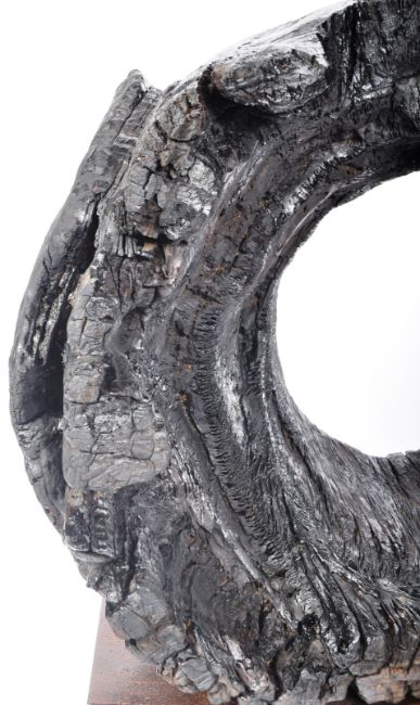 A large circa 2020 modern art sculpture comprising of large wood cross section of a live edge / living edge tree trunk being ebonised / painted black to give a charred effect and mounted on a large block plinth. Signed and dated 2020. Measures approx; 114cm x 80cm x 37cm.