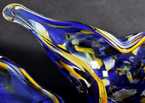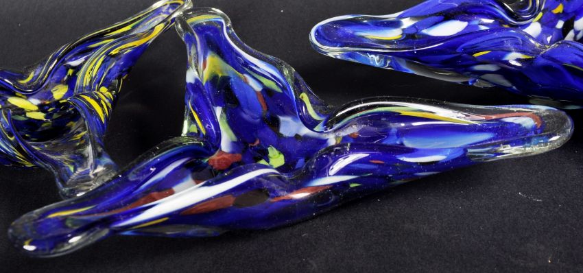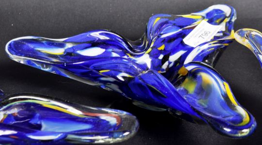 A set of four retro vintage 1960's Romanian studio art glass bowls in the manner of Murano. The set of glass bowls having a blue ground and being of triform shape. Label to underside. Measures approx; 21cm wide.