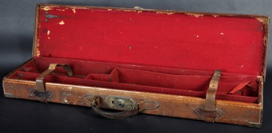 A vintage early 20th Century leather attache type shotgun / gun case. The case of rectangular form with unengraved circular brass name plate, leather straps and fittings. Measures approx; 82cm wide.