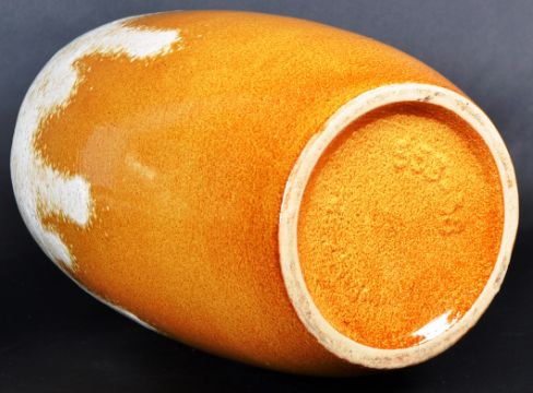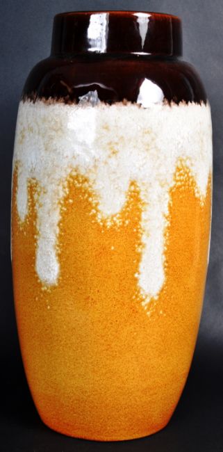 A retro vintage 1960's West German studio art pottery Fat Lava type vase. The vase having a brown and treacle ground with white waved band. Stamped to base 553-38. Measures 38cm tall.