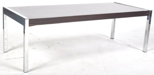 Manner Of Merrow Associates - A retro vintage 1970's teak and chrome coffee table comprising of a rectangular table top housed within a chrome square frame. Measures approx 36cm x 107cm x 46cm.