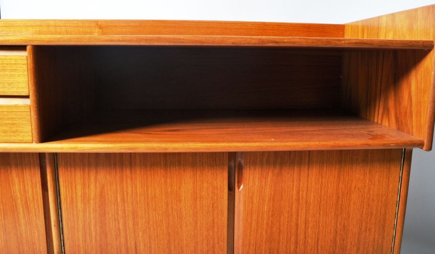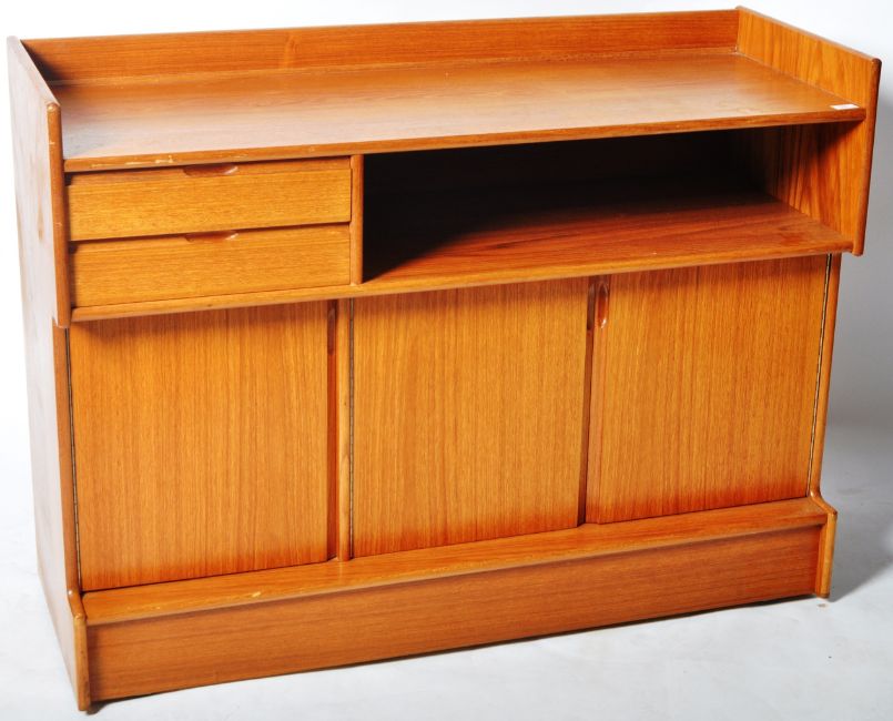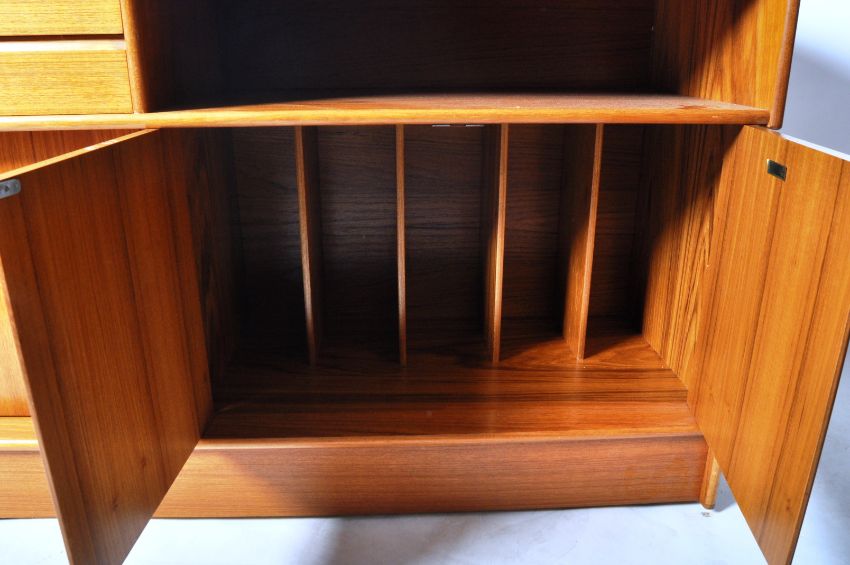 Turnidge Of London - A retro vintage mid 20th Century teak wood sideboard credenza / media unit comprising of a solid teak top with series of shelves and cabinets opening to reveal record storage. Measures approx; 91cm x 121cm x 45cm.