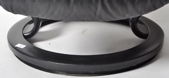 Ekornes - Stressless - A retro vintage late 20th Century armchair / lounge swivel reclining chair having black leather upholstery with thick cushioned armrests. All raised on bentwood supports and a circular swivel base. Measures approx; 106cm x 74cm x 67cm.