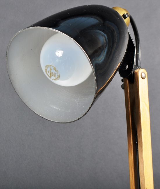 Terence Conran - Habitat - Mac Lamp No.8 - A retro vintage 1960's adjustable anglepoise desk / table work lamp light by Terence Conran for Habitat, Maclamp. The lamp having a black conical shade on a twin wood arm support and black finished base. Sold as untested by ourselves. Measures approx; 55cm.