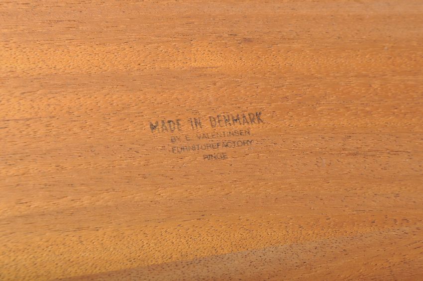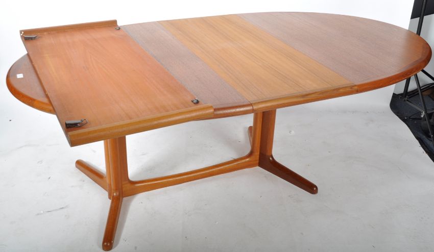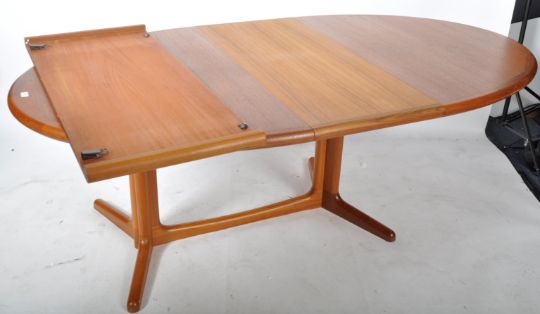 Edward Valentinsen - An original retro vintage 1960's Danish Scandinavian teak wood extending dining table of oval form having a good grain top with quarter panel cut board. Raised on splayed legs united by stretcher tier. Complete with two leaves. E Valentinsen Ringe stamp on the bottom. Measures approx; 71cm x 161cm x 115cm. When extended with both leaves approx; 259cm.