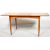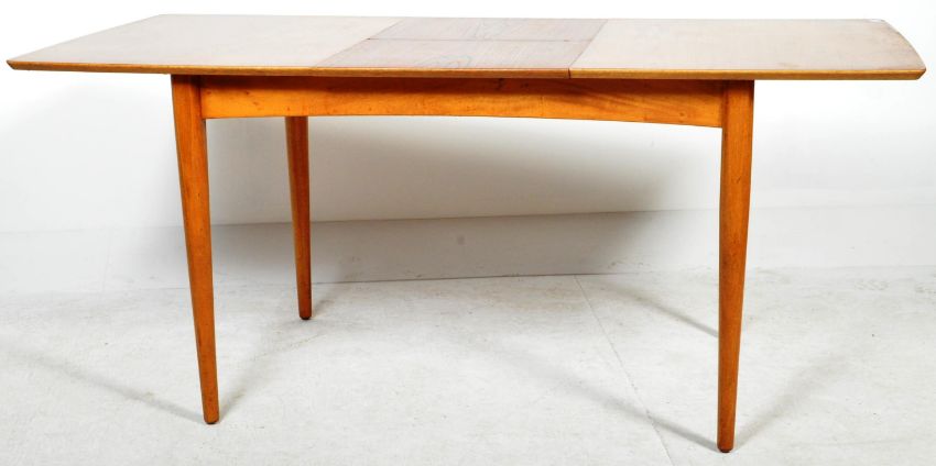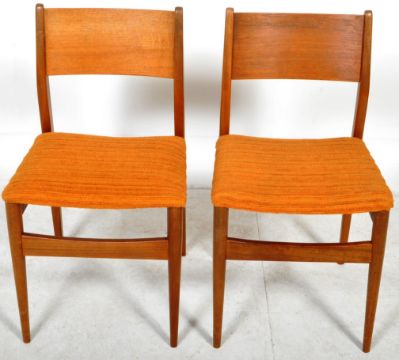 A retro vintage mid 20th Century Scandinavian teak wood dining table and four chairs. The table of rectangular form having a central extending leaf with all raised on tapering supports. The chairs having curved paneled backrests with striped fabric upholstery raised on tapering legs united by stretchers. Table measures approx; 73cm x 120cm x 84cm. Chairs measures approx; 80cm x 44cm x 45cm.
