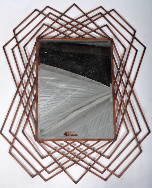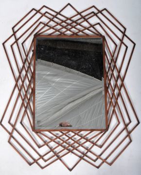 A retro vintage 1980's wall mirror comprising of a central mirror panel in metal frame consisting of multiple overlapping geometric shapes forming a spectrum. Measures approx; 117cm x 95cm.