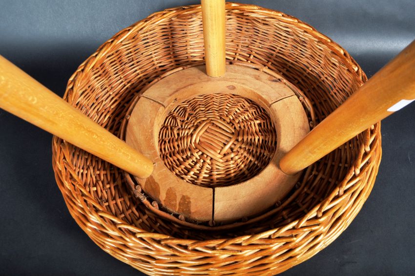 Tony Paul - A retro 20th Century 1960's milking stool having a circular basket weave wicker seat raised on turned splayed beech supports. Wear commensurate with age, mostly to bottom of the legs, overall good. Measures approx; 42cm x 44cm diameter.