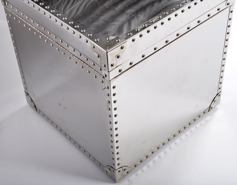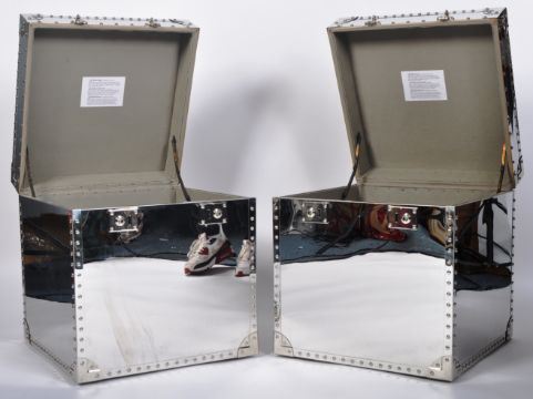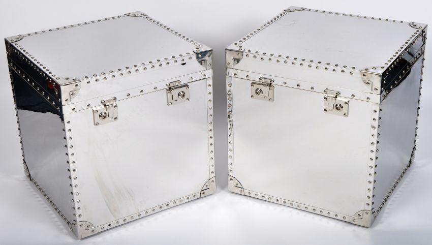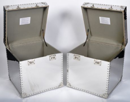 Andrew Martin Furniture  - British Contemporary Design - Original Andrew Martin ' Aviator style '  bedside chests / trunks. The chests, each with a hinged top having twin clasps  Finished with bound corners and studded details elsewhere.  Measures 60cm x 58cm x 58cm
