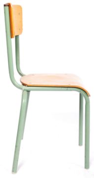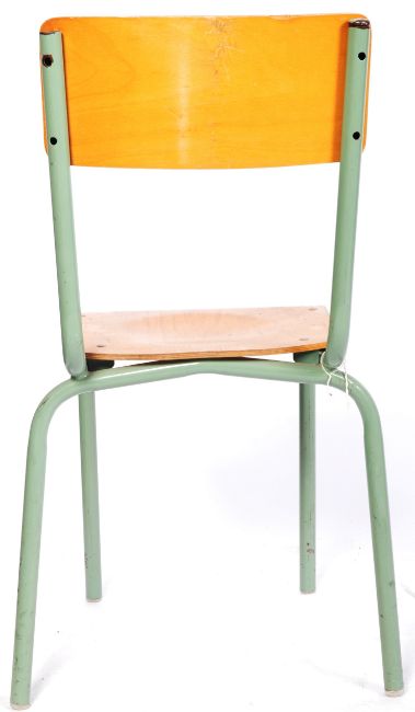 A set of six retro vintage mid 20th Century industrial school stacking chairs. The chairs having wood ply backs and seats with tubular frames and legs. Measures approx; 84cm x 51cm x 46cm.