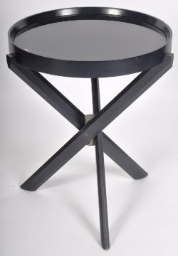 Kelly Hoppen Modern Design Interiors. A Kelly Hoppen original ebonised side - occasional table. The table of cross over leg form having a single gallery edged circular table top with inset glass. Measures 77cm high x 64cms wide