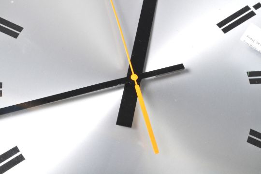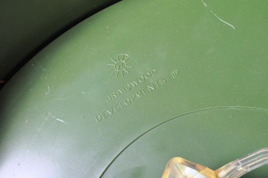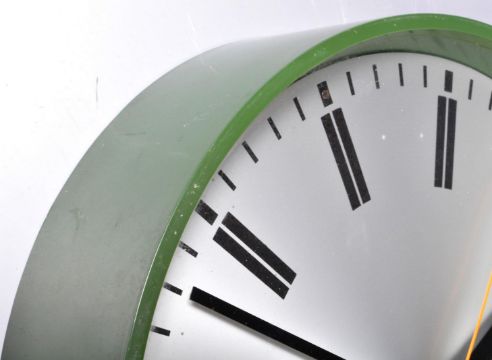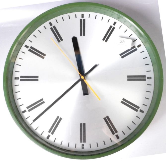 Robert Welch - Smiths - Braidwood Developments - An original 1970's retro vintage wall clock of green bakelite construction with silvered dial having black and orange faceted hands with bold dual baton numerals. Movement and hanging latch to verso. Made originally for the Military by Smiths for Braidwood who sold these in the late 1970's. Measures: 33cm.