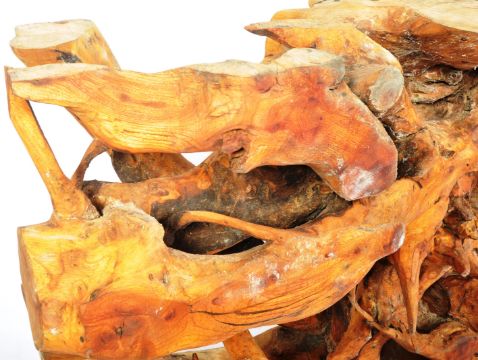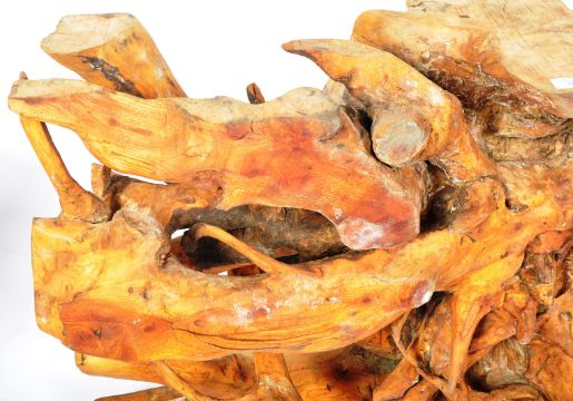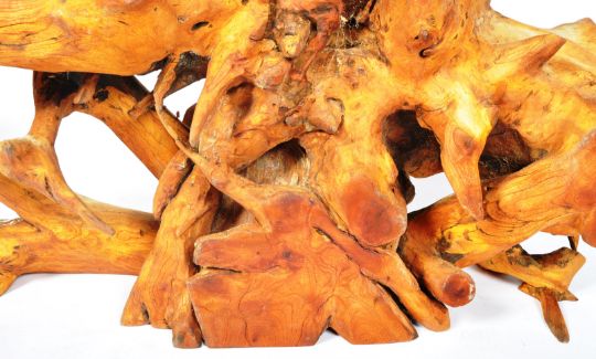 A large late 20th Century Modernist rustic live / living edge sculptural wood low coffee table / sideboard unit. The piece of natural wood form and could be led flat with glass on top or upright with marble / glass on top. No glass or marble present. Appears in good condition. Measures approx; 83cm x 130cm x 35cm.