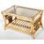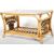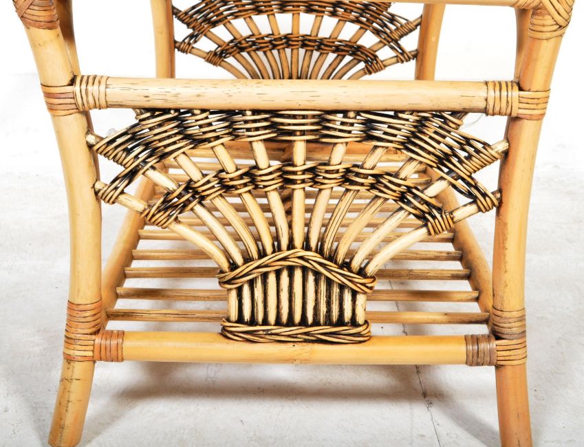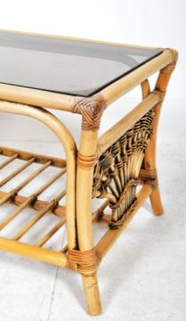 A retro vintage 20th Century 1980's bamboo and cane coffee / occasional table having an inset smokie glass panel with slated second tier magazine rack below. Raised on curved leg supports. Measures approx; 46cm x 79cm x 47cm.