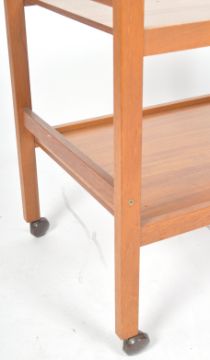 BRDR Furbo - Spottrup - A 20th Century Danish retro vintage teak wood two tier serving / tea / cocktail trolley by Brdr Furbo Furniture. The trolley having raised handle ends and two tiers all being raised on squared legs and trolley wheels. Measures approx; 64cm x 70cm x 46cm.