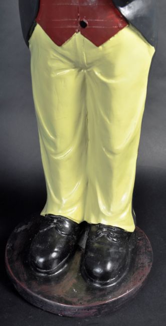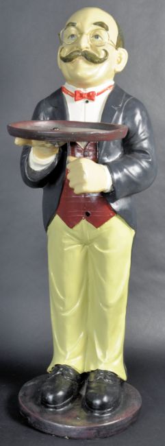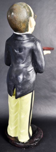 A retro vintage 20th Century 1970'S novelty dumbwaiter butlers stand in the form of a waiter. Constructed from fiberglass and being hand painted with the statue in a standing position holding a serving tray with all raised upon a circular plinth base. Wear commensurate with age with a broken finger to the under, overall good. Measures approx; 81cm x 29cm x 30cm.