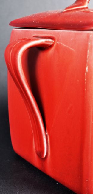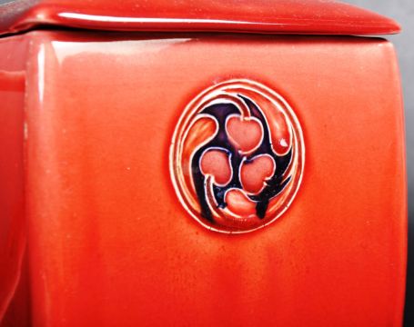 William Moorcroft for Liberty & Co - An early 20th Century Flamminian ware red glazed twin handled biscuit box and cover with tube-lined motif Art Nouveau decoration. Signed to the base. Overall good condition, crack running half way down one corner. Measures approx; 16cm x 17cm x 13cm.