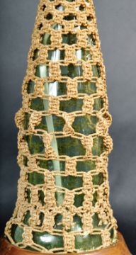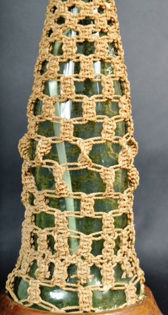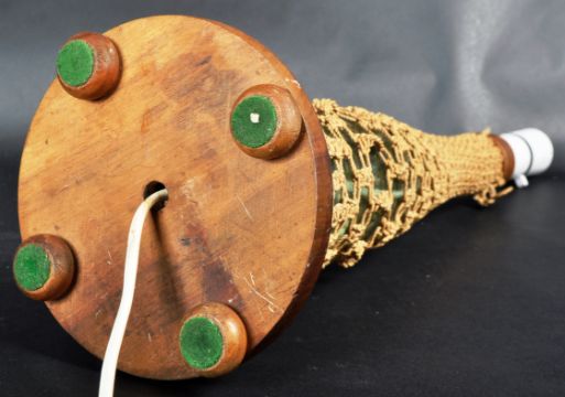 A retro vintage mid 20th Century Cornish glass bottle lamp constructed from a glass bottle wrapped in knotted half hitches raised on a circular teak base. Measures approx; 49cm tall.