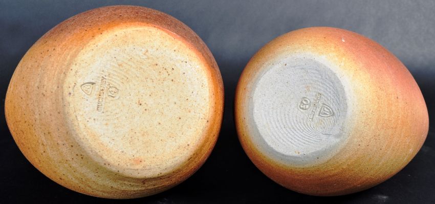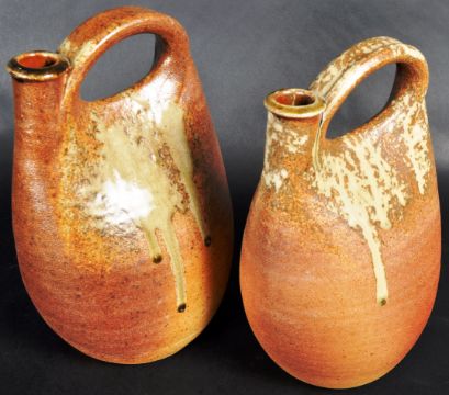 John Leech (born 1939) - Muchelney Pottery - A pair of retro vintage mid 20th Century studio art pottery stoneware flagons. Each with shaped handles with upright spouts and dripped glazed decoration. Each being 'Muchelney' to the bases and JL mark, one bearing 14 and the other 03. Overall good condition to each. Tallest measures approx; 29cm x 19cm.
