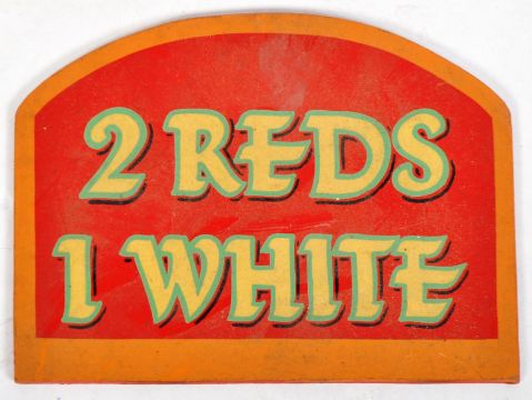 A mixed selection of vintage 20th Century fairground / funfair hand painted signage with many relating to possibly Tin Can Alley /  Hoopla. The signs for different coloured strikes with white, reds and blues being the main colours. Two signs with red and white sunburst decoration reading 'Win' and 'Wins' etc. Many being double sided with sme having gold lettering on red ground. Biggest sign measures approx; 23cm diameter.