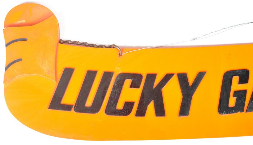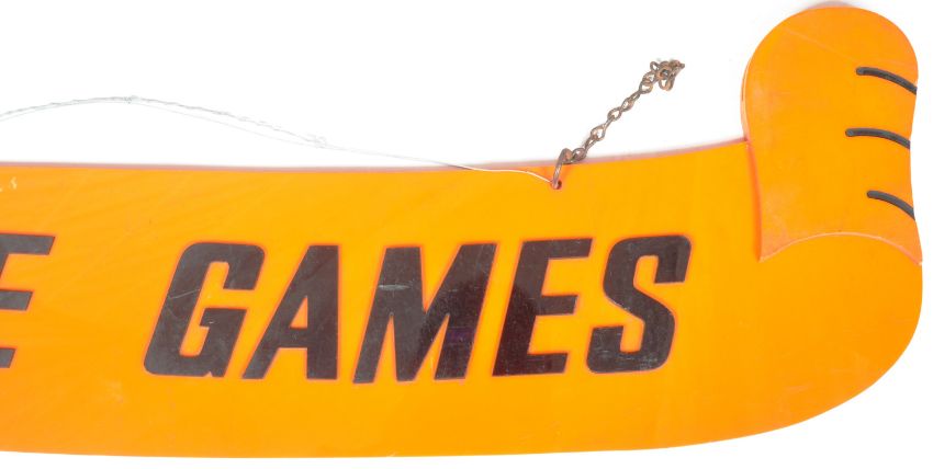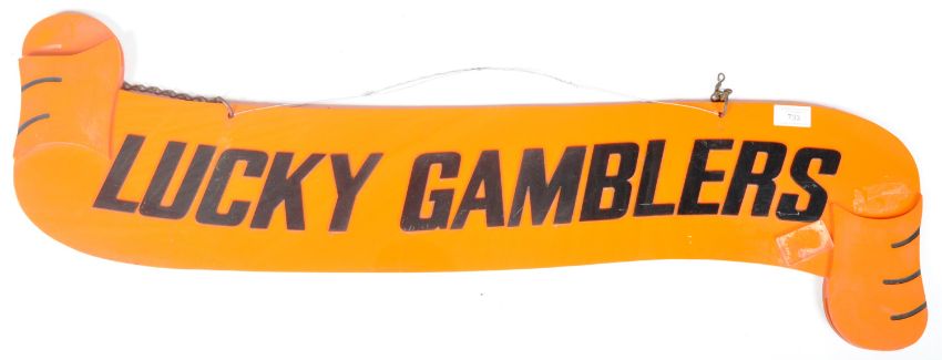A vintage 20th Century 1980's / 90's orange acrylic arcade double sided sign having applied acrylic black lettering reading 'Lucky Gamblers' to one side and 'Space Games'. Wear commensurate with age. Measures approx; 33cm x 92cm.