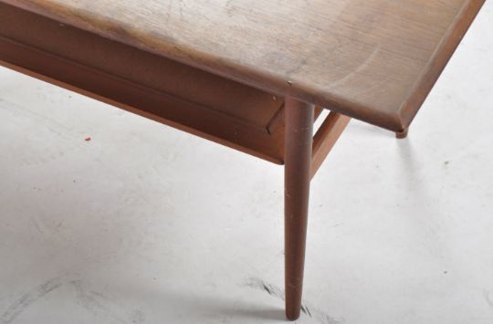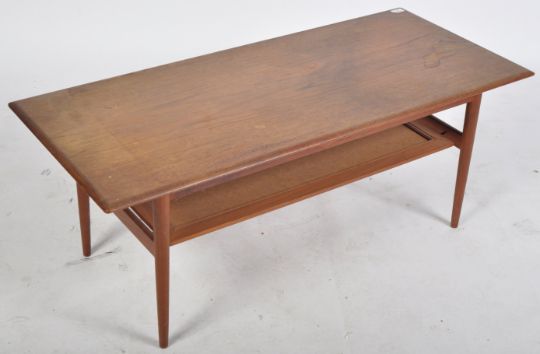 A retro vintage mid 20th Century Danish teak wood coffee table of rectangular form having a second tier rattan / cane woven under tier magazine shelf. All raised on tapering cylindrical supports united by stretchers. Measures approx; 47cm x 120cm x 52cm.