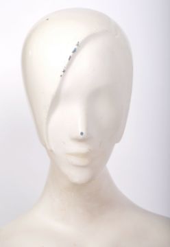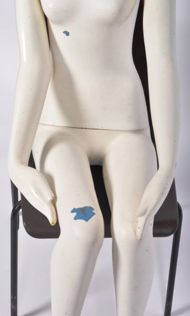 A 20th Century Art Deco style haberdashery shop display clothing mannequin. The female mannequin modelled in a seated position with legs touching and mouded hair. The sitting mannequin measures approx; 135cm.
