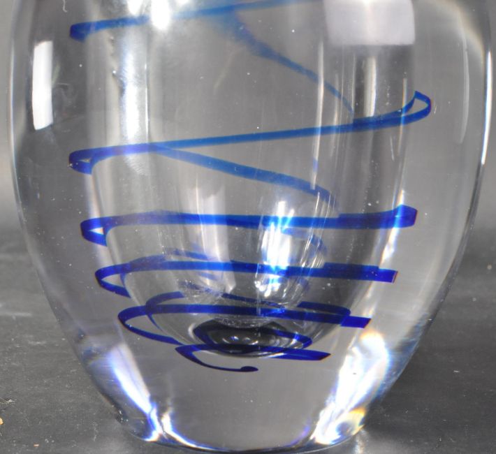 Elis Bergh - Kosta Boda - A thick and heavy retro 20th Century 1950's Swedish studio art glass vase of clear form having central blue swirl decoration. Signed to the base. Measures approx; 14cm x12cm diameter.